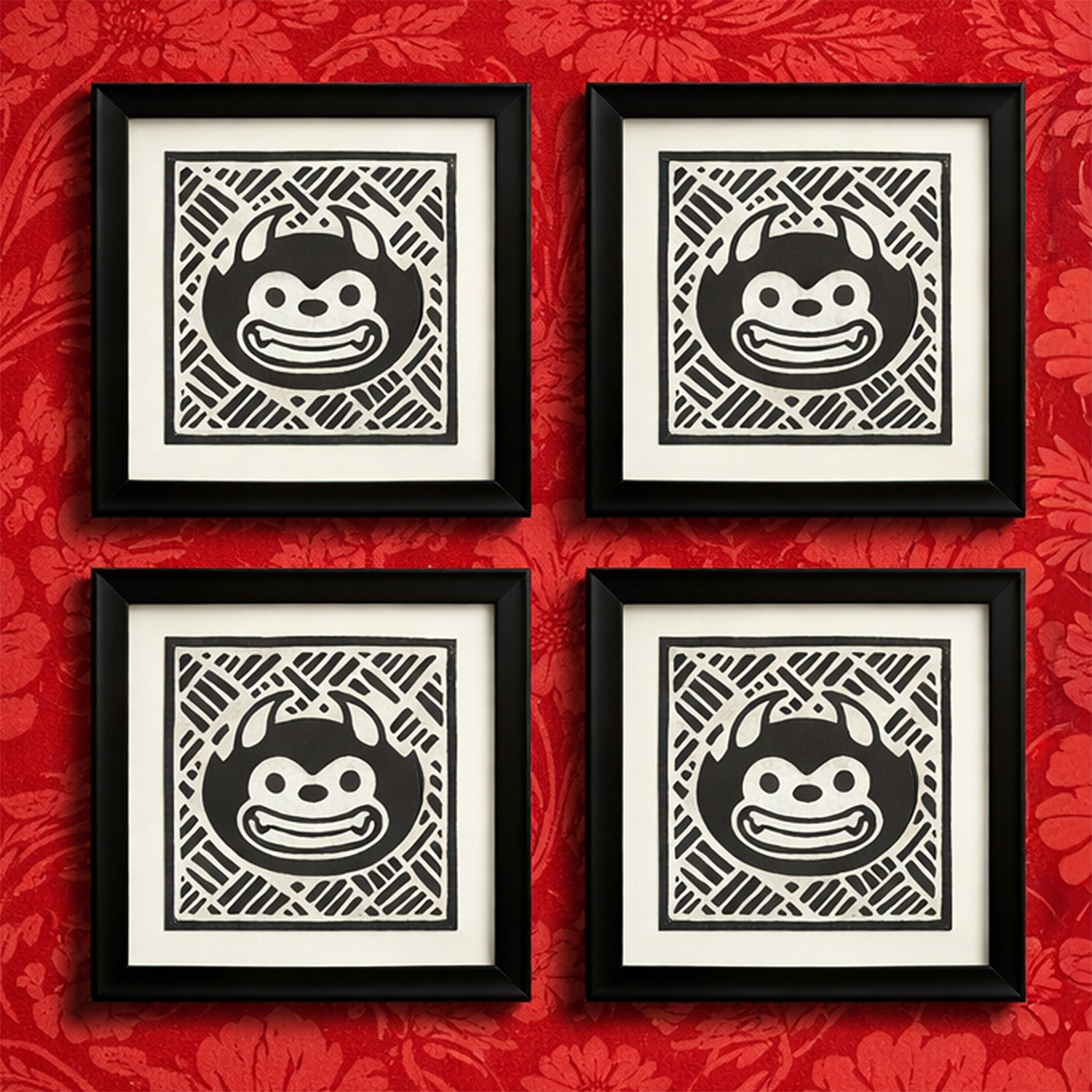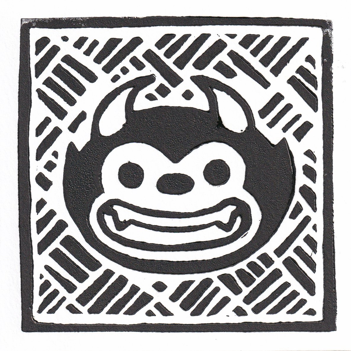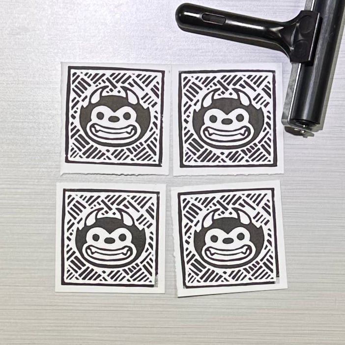 This 4 × 4 inch Lucky Diablo linocut print is hand-printed using rich black Cranfield relief ink on BFK Rives printmaking paper, known for its soft texture and archival quality. Each print is pulled by hand, resulting in subtle variations that make every impression uniquely its own.