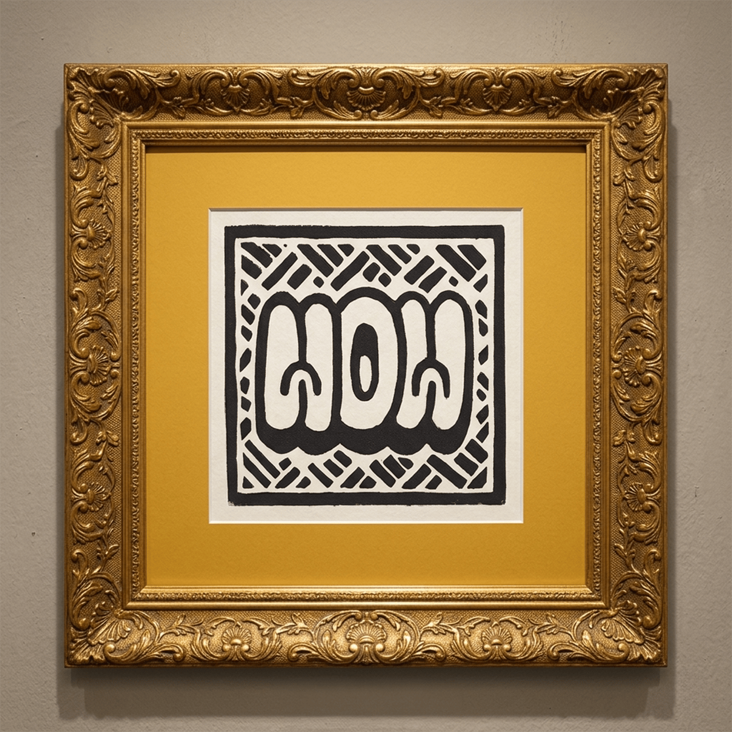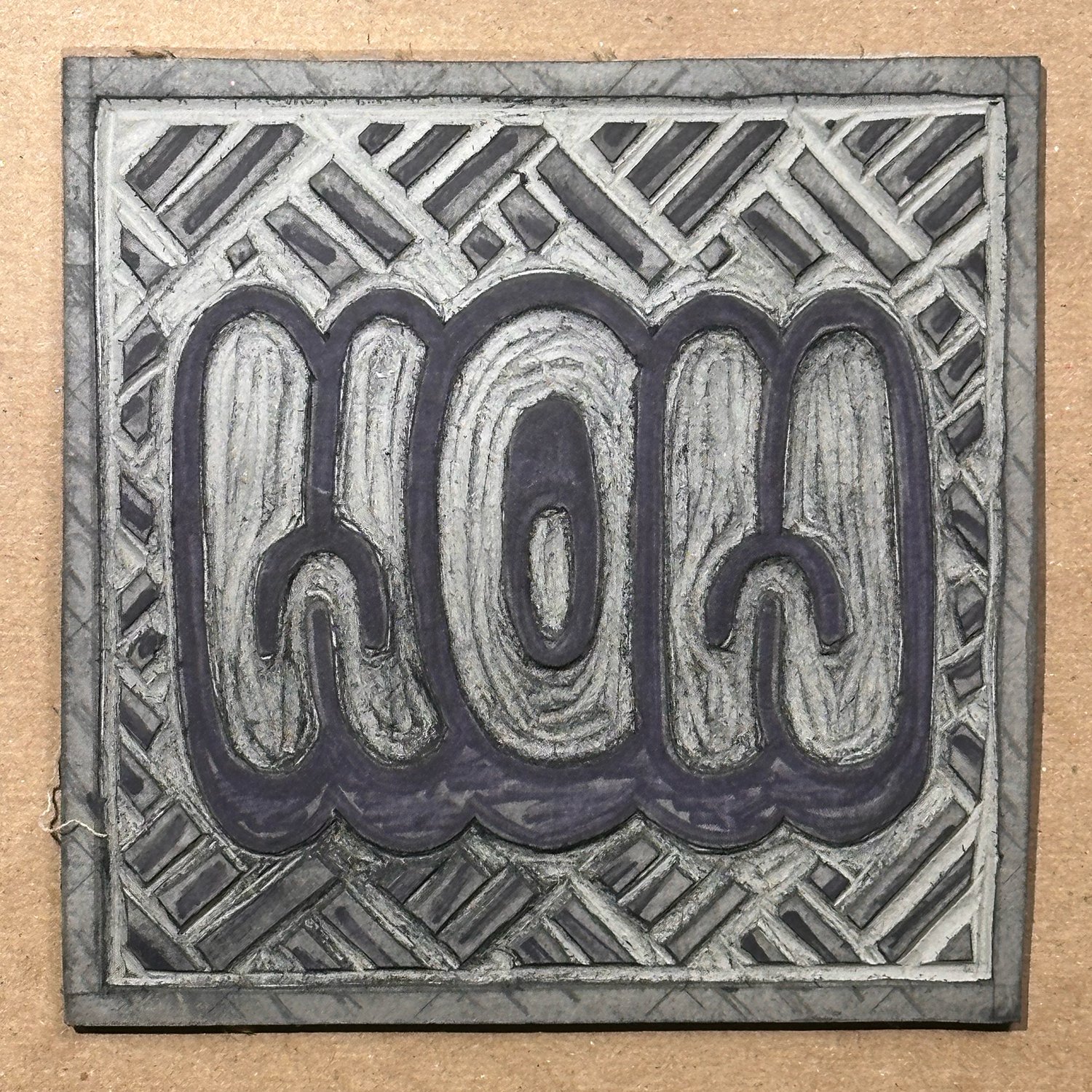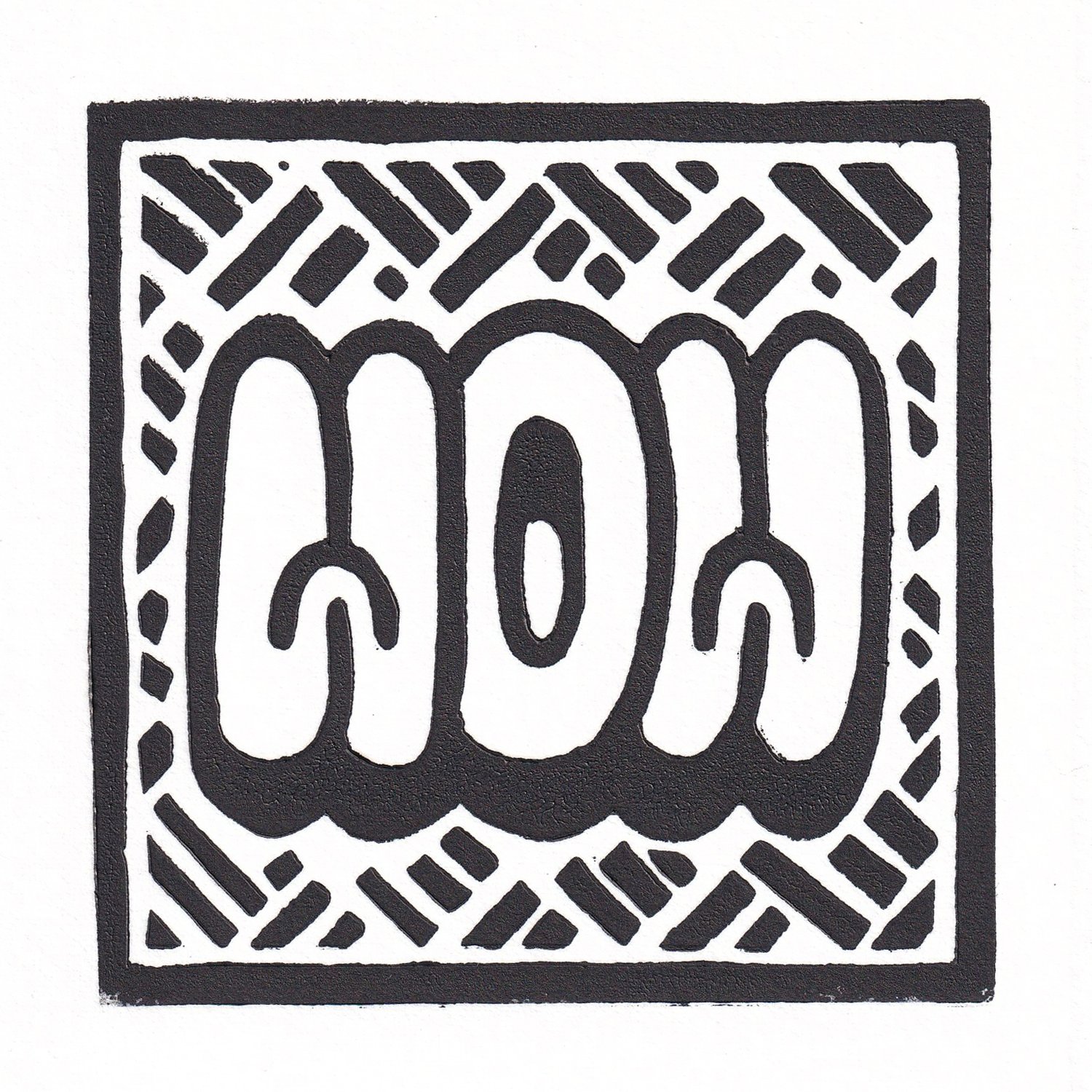 This 5 x 5 inch linocut is hand-carved and hand-printed on Rives BFK, a rich, archival paper known for its soft texture and ability to hold deep, bold ink. The piece features my original “WOW” design, framed by a rhythmic pattern that balances playful energy with graphic punch.